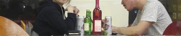 It would make for a lovely portrait. The loose strand of thought drifts through your consciousness, mingling with sound and sight. You can see yourself with a drawing implement in one hand, a blank canvas in the other - but oriented in a way that diffuses any invasion of privacy, of intimacy. Here is the composition: the table, the bottles, the young woman, the young man. Quick strokes, careful observation; a still-life in the making.