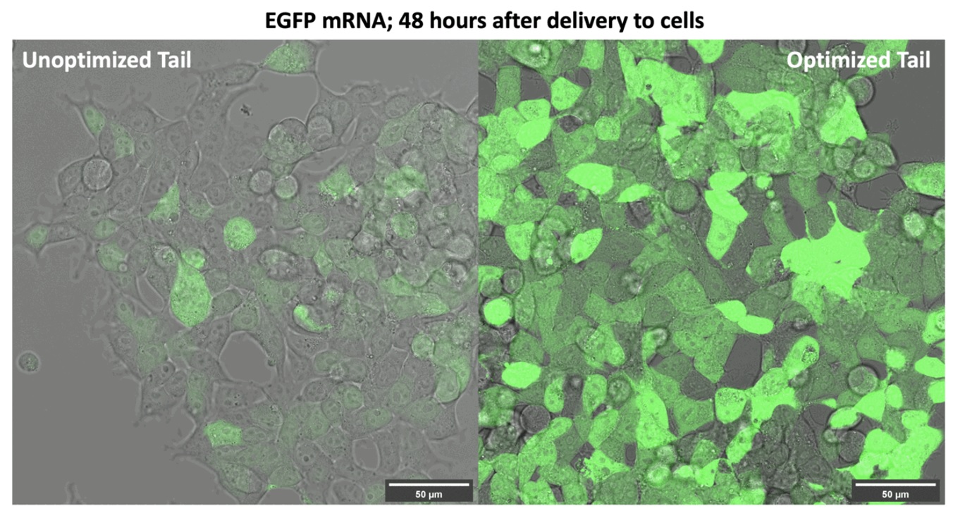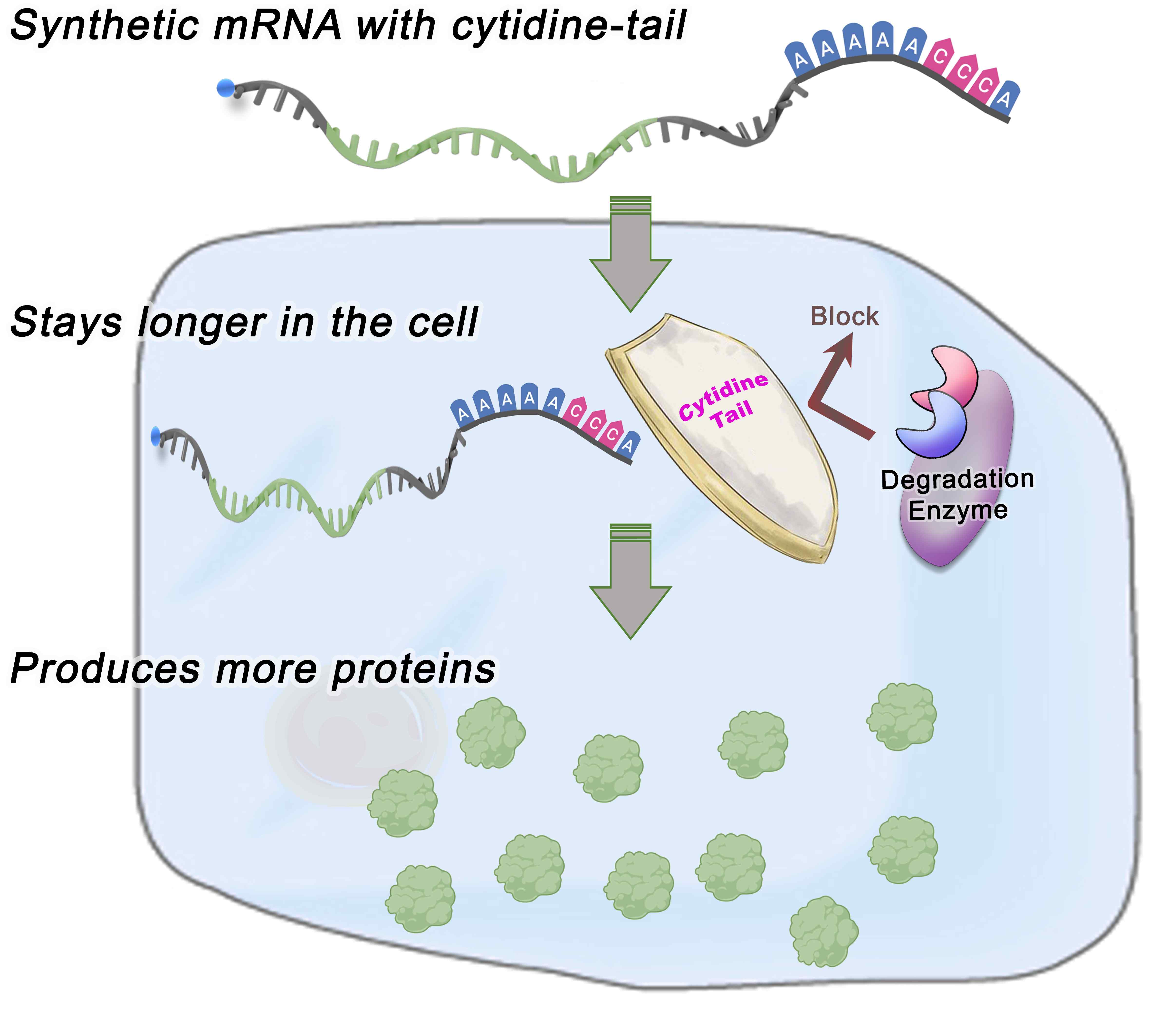 mRNAs can be synthesized to teach our cells in making any kind of proteins, such as antigens, enzymes and hormones which are essential in fighting infections and regulating bodily functions, so mRNA is arguably a preferred options for vaccines and treatment for many different kinds of diseases. However, high dosage and repeated injections are often required for mRNA drugs and vaccines in order to generate sufficient amount of protein in the body, so enhancing mRNA’s effectiveness – such as by increasing its protein production efficiency, is a hot subject among scientists as our immune system, for example, could work better with more certain antibodies.