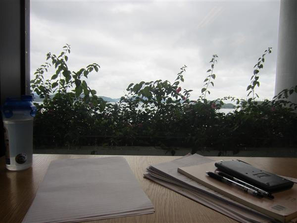 At least, that's what you'd like to think about this wooden table sitting in a corner facing the sea at 9 a.m. The floor is nearly empty, save for the presence of the cleaning staff, the low hum of the air conditioning, the occasional cough of another student poring over books and notes.