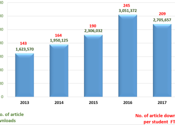 Electronic journals are a daily staple of scholarly research. We have done some analysis of how heavily used our e-journals have been. The chart below shows the total number of article downloads and the number of article downloads per student FTE for the past five years (from 2013 to 2017).