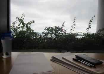 At least, that's what you'd like to think about this wooden table sitting in a corner facing the sea at 9 a.m. The floor is nearly empty, save for the presence of the cleaning staff, the low hum of the air conditioning, the occasional cough of another student poring over books and notes.