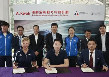 在体育专员杨德强先生、香港体育学院(体院)副院长蔡玉坤先生、体院精英训练科技总监苏志雄博士、科大工学院副院长莫国泰教授、中国香港单车总会主席梁鸿德先生、体院单车总教练沈金康先生及精英单车运动员李慧诗的见证下,郭基辉先生、体院院长李翠莎博士及负责项目的科大机械及航空航天工程学系讲座教授张欣教授今日签署合作协议,正式启动“A. Kwok运动空气动力科研计划”。在是次计划中,张教授及其团队与竞技运动中具领导地位的技术人员合作,协助运动员于赛事中提升竞争力。