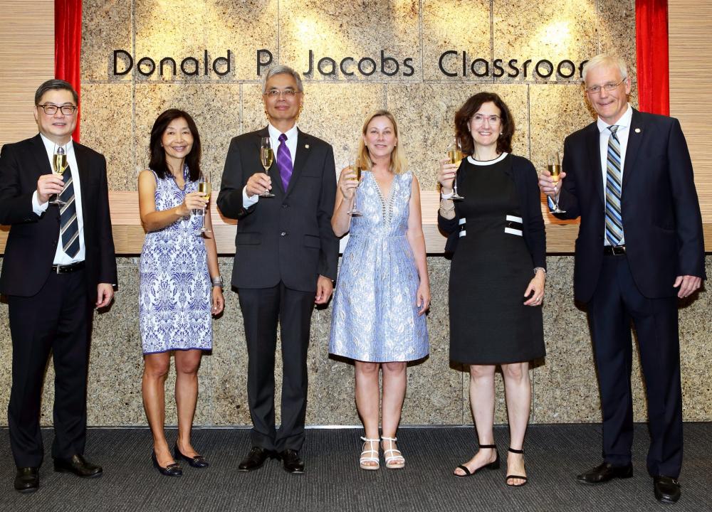 由1975年至2001年担任美国西北大学凯洛格商学院院长的Donald Jacobs教授,乃享负盛名的凯洛格-科大EMBA课程创办人之一,并创立了凯洛格EMBA全球网络。在他的领导下,凯洛格与科大于1998年合作推出亚洲首个合办EMBA课程,随后课程迅速擢升为全球排名第一的EMBA课程。Donald P. Jacobs教室的命名标志着Jacobs院长的远见,以及科大与凯洛格的长期伙伴合作关系。