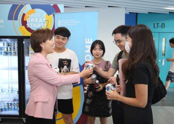 受超强台风苏拉影响,香港科技大学(科大)原订于上周五举办的「Have a Great Start!」开学欢迎活动延至今日(九月四日)举行。去年10月上任、今年首次以校长身份与同学一起迎接新学年的叶玉如教授,与一众大学管理层,在校园向同学派发由科大校友创立的精品品牌汽水,为同学打「气」,并跟他们一同参与幸运轮抽奖活动派发小礼品。叶校长于开学日向师生及教职员发电邮,鼓励他们充分利用大学的设施和资源,全心投入追求学术和研究卓越,并把握所有能促进个人成长和发展机会。