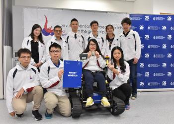 HKUSTwheels轮椅由江春李、刘诗灏、李河潾、陆承骐、孙文杰、戴欣蓓及郑悦宜七位同学研发,配置了耐用的输送带系统,可以对应不同的地型。输送带的设计可避免轮椅车轮被卡住,或从楼梯上滑落的问题。用家乘坐这部轮椅,不但可以正面攀爬楼梯,其智能自动化系统更可令座位于上斜时维持于水平位置,令用家更为方便及舒适。