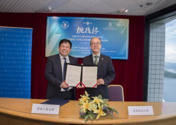 香港科技大学(科大)今日与广东工业大学(广东工大)签订协议,合办被誉为大学生科技创新的奥林匹克盛会「挑战杯」,此为该赛事成立25年来首度有本地大学承办。两年一度的「挑战杯」是全国大学生科技学术竞赛的盛事。自1989年清华大学举办首届活动以来,规模日增,由最初19所高校数百名学生参与,至今天逾400所大学近7,000名学生竞赛,为全国最具代表性的科技创新赛事。历届获奖者包括1名中国工程院院士、近10位国家重点实验室负责人以及220多位教授和博士生导师。科大校长陈繁昌教授与广东工大校长陈新教授签署合作协议,就双方如何推进第14届挑战杯订定合作细则,为粤港高校首次合办此盛会展开序幕。作为一所国际研究型大学,科大将致力为「挑战杯」增添国际元素,除致力吸引更多海外学生出席观摩,更会安排讲座以及一系列活动促进中港两地参赛者交流,以及为得奖者寻觅海内外投资者。陈繁昌校长表示﹕「挑战杯乃全国大学的盛事,推动创新,能晋身决赛的队伍都是各省市比赛中胜出的精英,科大生多年来亦积极参赛切磋。科大很荣幸明年合办此盛事,共同推动科技创新、技术转移以及为社会经济发展,培育优秀年轻人,并将竭力将此股创新热,传播到两岸四地以致海外高等学府。」陈新校长表示﹕「本届挑战杯竞赛首次由粤港两地高校联合承办,承办模式本身就是一次伟大的创新和挑战。我们将按照『强调改革创新、强调市场机制、强调成果转化、强调粤港特色』办赛理念,认真筹备各项承办工作。抓住此次承办机遇,营造浓厚的创新氛围,建立健全多模式创新人才培育体系,培养大学生创新能力。同时促进粤港两地大学生科技创新合作,推动搭建粤港高校科技创新深度交流和协同的大格局。」为标志两地大学首次合作,科大与广东工大已于本年7月率先举办「挑战营」,安排粤港两地十多所大学逾40名学生,分别到香港及广州进行一星期的交流参观。科大亦正筹备邀请国际著名学者以及创新科技界成功人士,于明年比赛期间到广州为参赛学生演讲。至赛事完满结束后,科大计划邀请创业投资者与得奖同学在港会晤,为得奖科技及作品寻找市场化机会。科大学生自1997年起参与「挑战杯」,多年来屡获殊荣。去年比赛科大六个队伍合共夺得一名一等奖、三名二等奖及两名三等奖,成绩骄人。