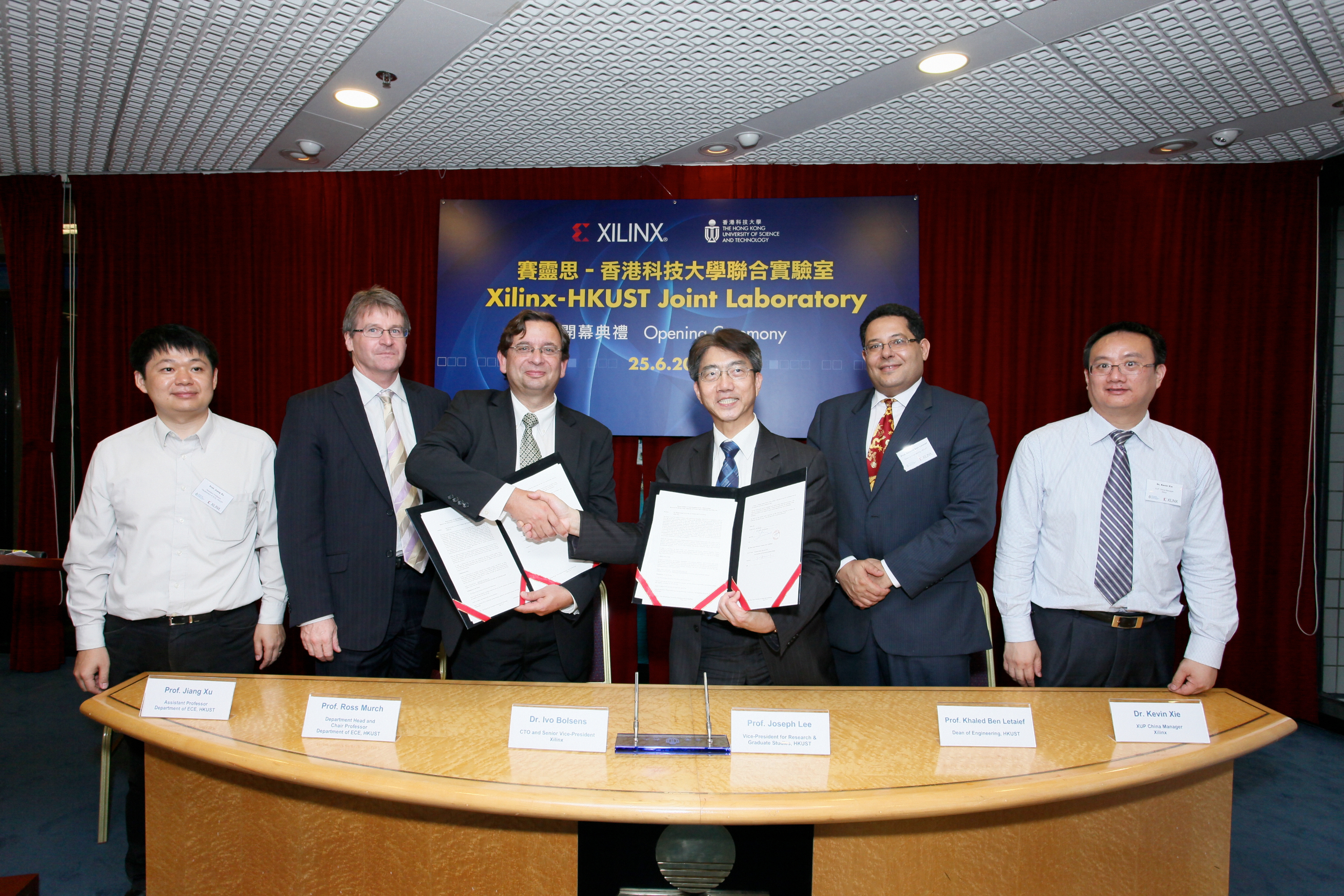 开 幕 典 礼 于 香 港 科 技 大 学 校 董 议 事 室 大 堂 举 行 , 出 席 嘉 宾 包 括 香 港 科 技 大 学 副 校 长 ( 研 发 及 研 究 生 教 育 ) 李 行 伟 教 授 、 赛 灵 思 公 司 全 球 高 级 副 总 裁 兼 首 席 技 术 官 Ivo Bolsens 博 士 、 赛 灵 思 公 司 亚 太 区 销 售 及 市 场 副 总 裁 杨 飞 、 香 港 科 技 大 学 工 学 院 院 长 李 德 富 教 授 、 香 港 科 技 大 学 电 子 及 计 算 器 工 程 学 系 系 主 任 穆 乐 思 教 授 、 赛 灵 思 大 学 计 划 大 中 华 区 经 理 谢 凯 年 博 士 , 以 及 赛 灵 思 - 科 大 联 合 实 验 室 创 始 主 任 须 江 博 士 。 在 开 幕 典 礼 上 , 李 行 伟 教 授 和 Ivo Bolsens 博 士 签 署 了 赛 灵 思 - 科 大 联 合 实 验 室 合 作 协 议 , 并 为 实 验 室 牌 匾 揭 幕 。