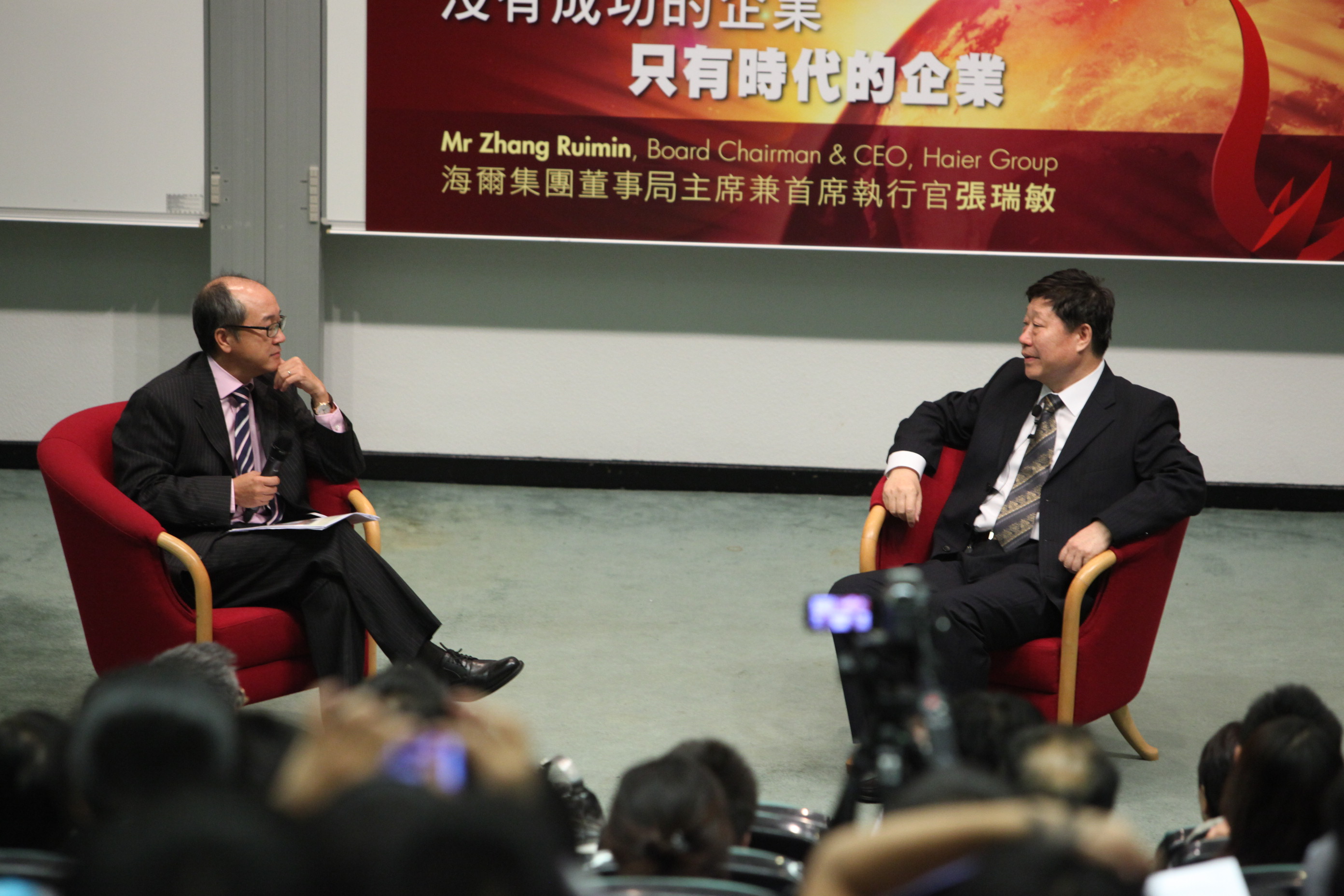香 港 科 技 大 學 ( 科 大 ) 今 日 邀 請 海 爾 集 團 始 創 人 兼 首 席 執 行 官 張 瑞 敏 先 生 擔 任 「 傑 出 講 座 系 列 」 主 講 嘉 賓 , 首 次 來 港 以 「 沒 有 成 功 的 企 業 • 只 有 時 代 的 企 業 」 為 題 , 與 500 多 名 科 大 師 生 、 校 友 、 企 業 管 理 人 員 、 社 會 賢 達 等 , 分 享 海 爾 自 主 管 理 的 實 踐 經 驗 , 並 探 討 企 業 持 續 發 展 的 要 訣 。